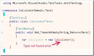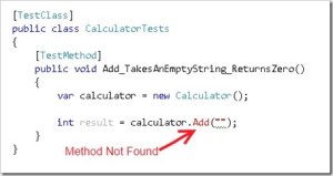 At this point its time to write production code, and creating the calculator class is enough to make the tests compile, so its back to the test code to continue writing the test