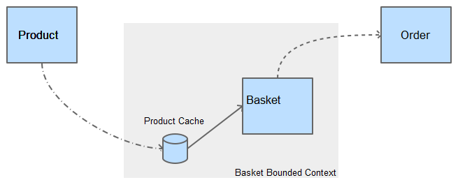 The basket bounded context contains our basket aggregate and a product cache that is maintained using events from the product aggregate.  The basket will raise events that are consumed by the order service to maintain its own cache.
