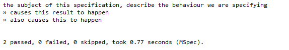 If the code required to make the test is going to be complex then I will drop down into Machine Specifications, using the scenario as my requirement guide, and write TDD style tests to drive the required functionality, more of that in the next post!