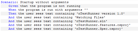 I actually copied these definitions from the NUnit text output window, when the specifications are run without definitions, the test runner outputs example steps for the developer to copy. Notice how the “And” has now become a “Given”, the ‘And’ keyword becomes the parent ‘Given’, ‘When’ or ‘Then’, depending on where it is used. The text written in the scenario becomes the attribute value within the step definition